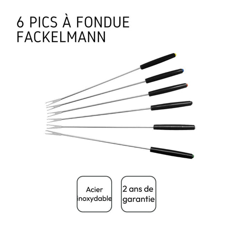 Fackelmann vous propose ce lot de 6 piques à fondue savoyarde avec des billes de couleur au bout pour les reconnaître. Accrochez un morceau de viande à un de ces pics et plongez-le dans l'huile bouillante pour le cuire.