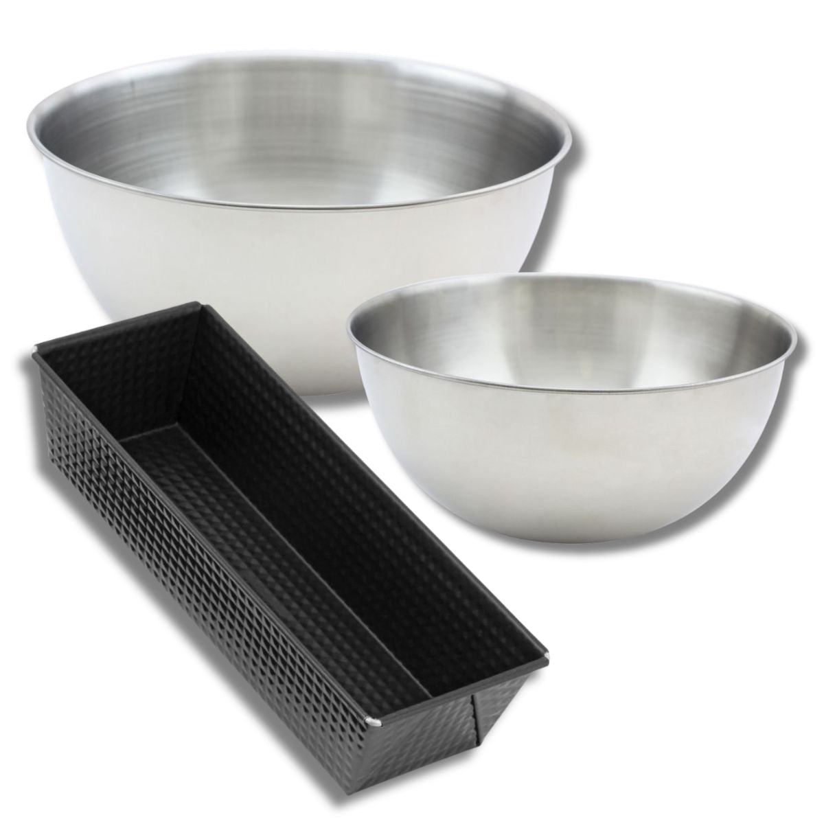 Découvrez cet ensemble de pâtisserie comprenant un moule à cake noir Zenker de 30,5 cm, deux bols à mixer en inox Fackelmann de 25 cm et 20,5 cm, ainsi qu'une spatule en silicone Zenker de 25 cm. Idéal pour réaliser toutes vos recettes.