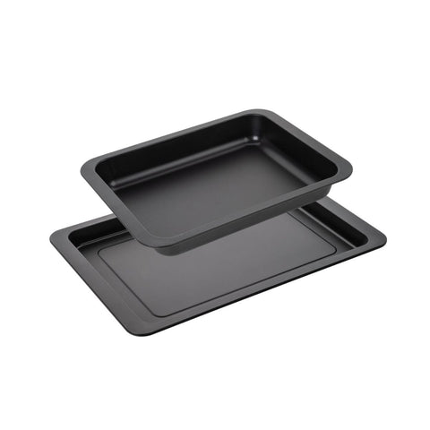 La fabrication allemande de ces accessoires de cuisson est en acier avec un revêtement antiadhésif en Téflon pour la plaque de four et un revêtement en ILAG Special pour le plat de cuisson four.