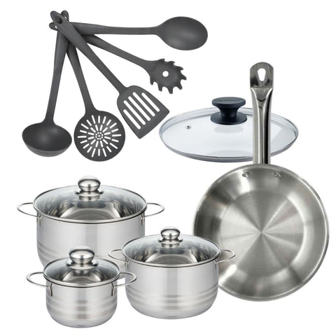 Découvrez notre ensemble de cuisine composé d'une poêle en inox 18/8 de 28 cm Fackelmann Eterna et son couvercle en verre, et trois faitouts inox de 16, 20 et 24 cm, accompagnés de 5 ustensiles. Idéal pour toutes vos préparations culinaires.