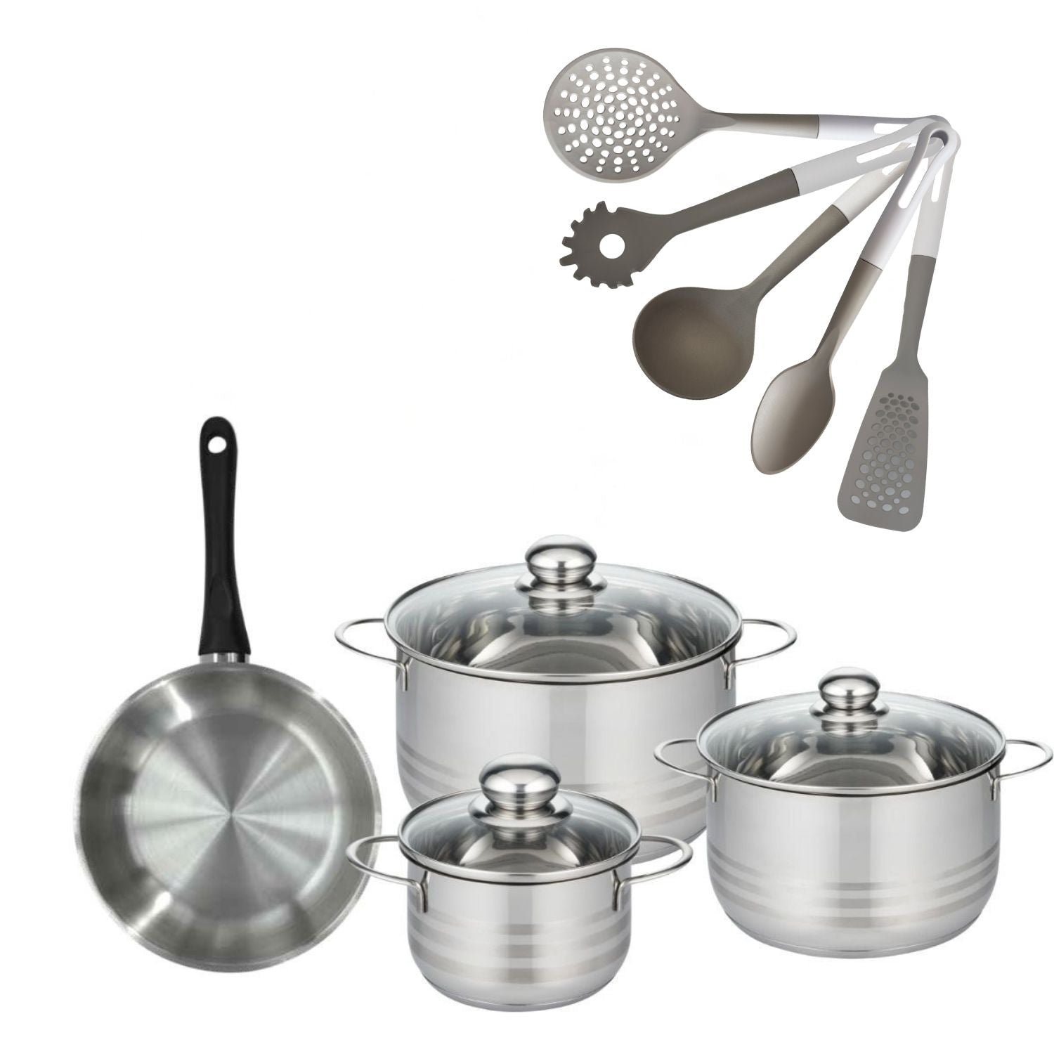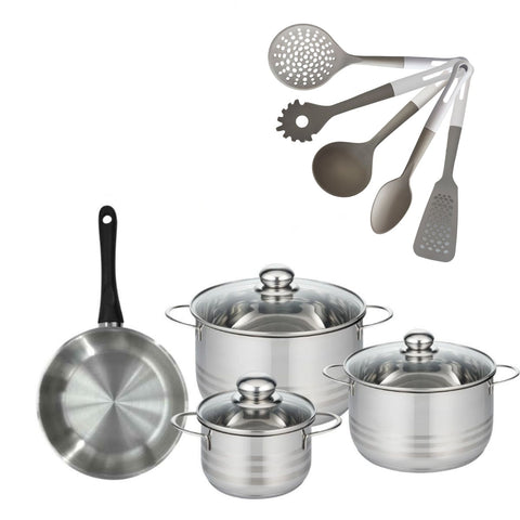 Découvrez l'ensemble Fackelmann Geneva incluant une poêle de 20 cm et trois faitouts en inox (16, 20, 24 cm) pour une cuisine performante et élégante. Complété par 5 ustensiles essentiels pour un usage quotidien.