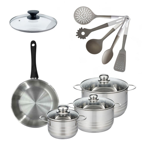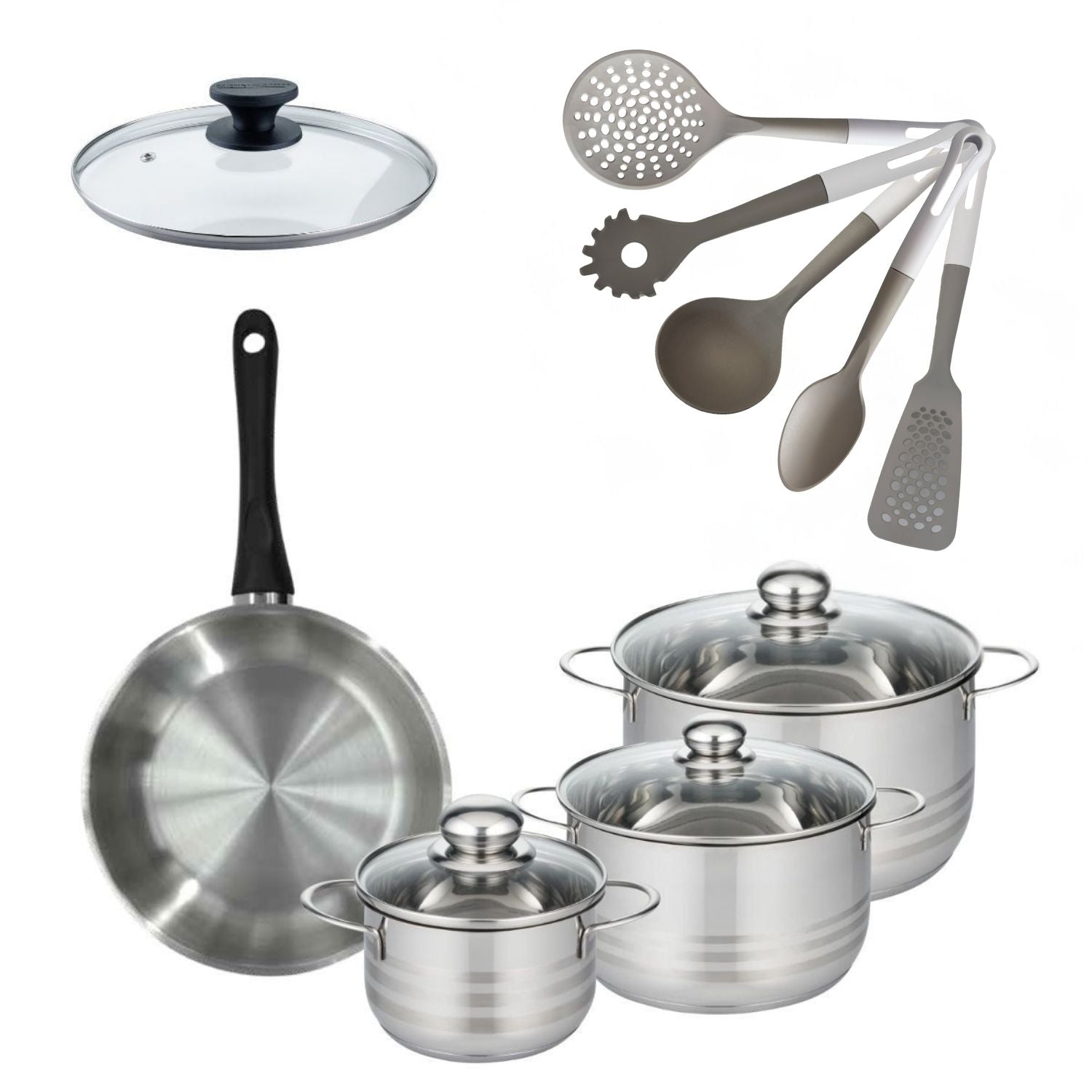Découvrez l'ensemble ultime pour les passionnés de cuisine : une poêle en inox 24 cm et trois faitouts en acier inoxydable de 16, 20 et 24 cm de la collection Fackelmann Généva, accompagnés de cinq ustensiles pratiques pour toutes vos préparations culinaires.