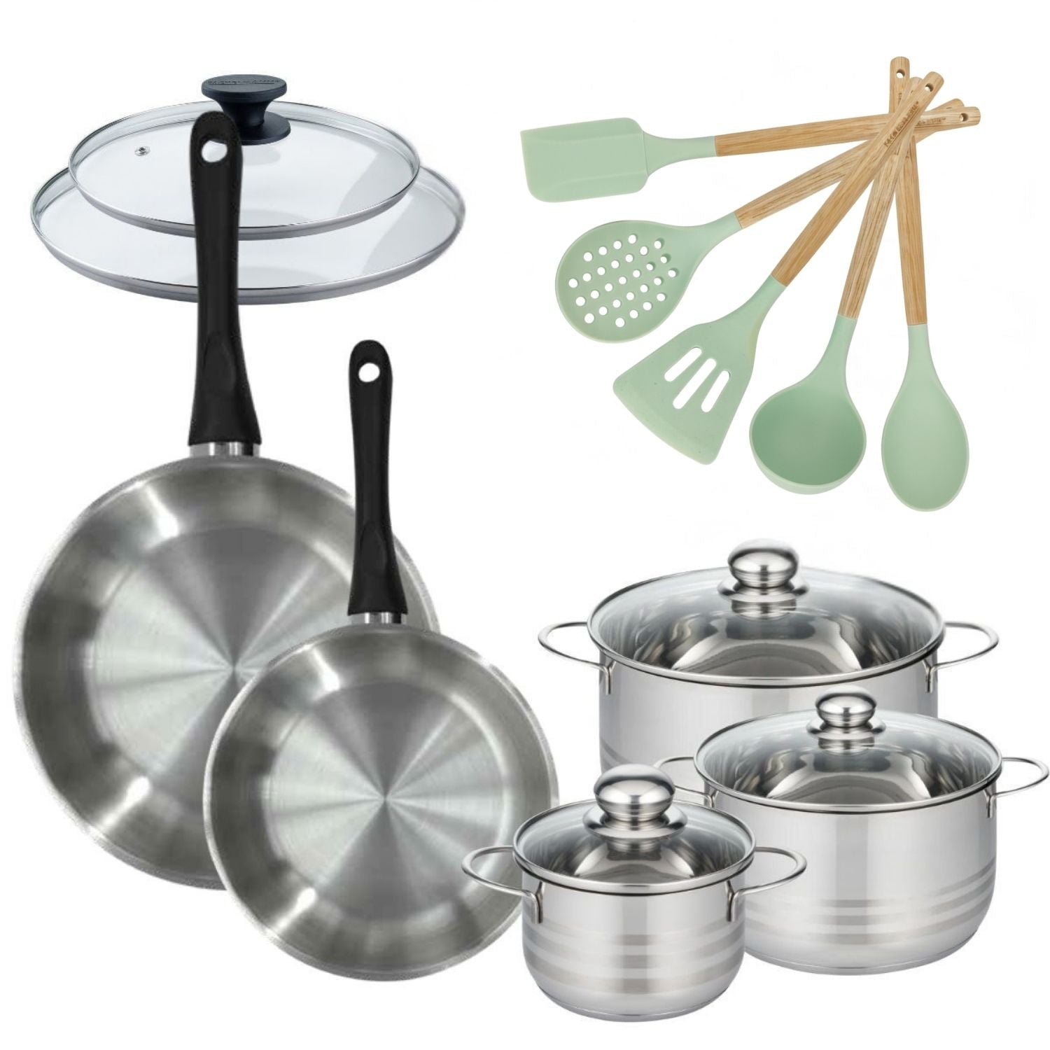 Découvrez la gamme Fackelmann Généva avec ce lot complet incluant des faitouts et poêles en inox pour une cuisson uniforme, accompagnés de 5 ustensiles pratiques et 2 couvercles en verre pour une cuisine maîtrisée.