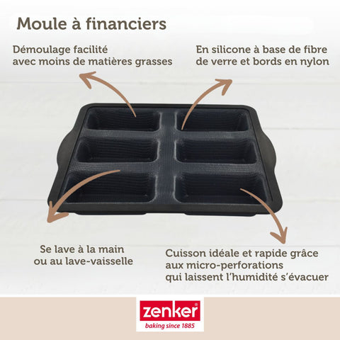 Zenker vous propose ce moule à 6 financiers ou moule à mini cakes en silicone à base de fibre de verre pour réaliser des mini cakes salés, des financiers aux amandes. Dans notre moule à financiers vous n'avez pas besoin de mettre de matières grasses ou de papier sulfurisé !