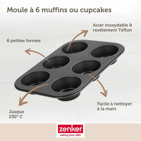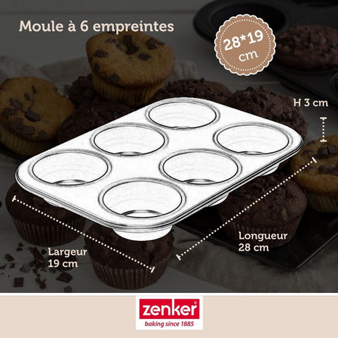 Zenker vous propose ce moule à muffins avec 6 empreintes. Notre moule est parfait pour les muffins car il dispose d'une bonne profondeur pour faire des gâteaux bien hauts. Avec notre moule à muffins vous pourrez également préparer des cupcakes et même des petits gâteaux salés pour un apéritif par exemple !