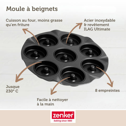 Zenker vous propose ce moule à beignets avec 8 empreintes pour préparer de bons beignets sains car cuits au four. À vous les beignets aux pommes, les donuts au sucre ou encore les bagels maison.