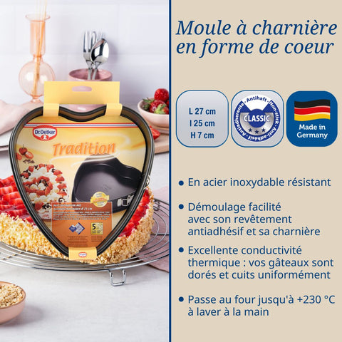 Le moule à gâteau cœur Dr Oetker est idéal pour vos desserts de Saint-Valentin, les anniversaires, ou toutes autres surprises pleines d’amour. Ce moule est souvent recommandé pour son étanchéité, son excellente conductivité thermique et ses propriétés antiadhésives impressionnantes.