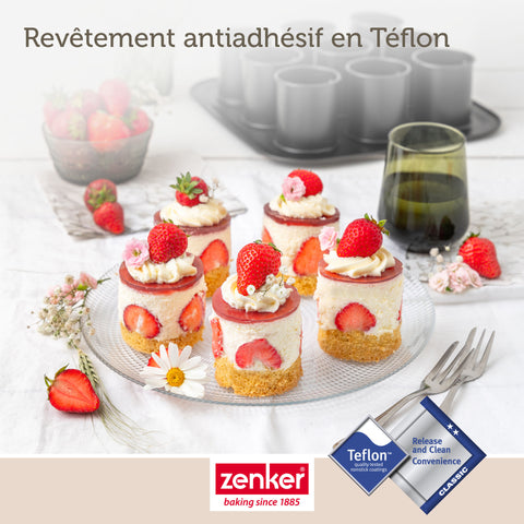 Zenker vous propose ce moule à gâteau individuel contenant 9 empreintes de forme cylindrique et muni d'un couvercle permettant à la fois de maintenir les pâtisseries mais aussi de les décorer à l'aide de sucre glace ou de cacao amer.