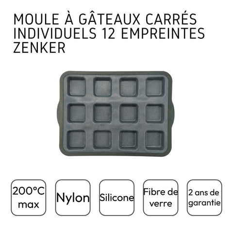 Zenker vous propose ce moule à gâteaux en silicone à base de fibre de verre avec lequel vous pouvez cuire 12 petits gâteaux carrés. Ce moule à gâteaux individuels est parfait pour cuire des mini brownies.