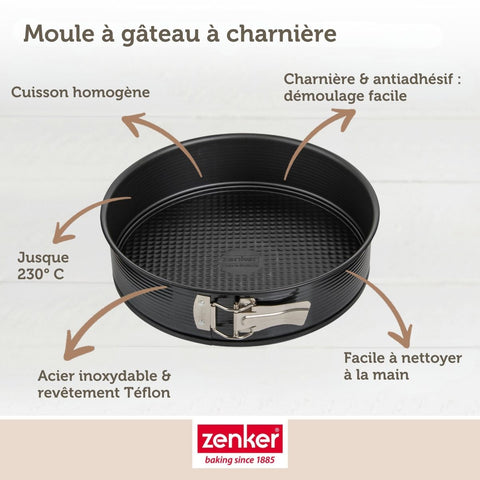 Zenker vous propose ce moule à manqué à charnière. Notre moule à manqué est idéal pour cuire vos gâteaux ! Vous pouvez également préparer des gâteaux froids. Grâce à la charnière, le démoulage est très facile, il suffit de l'ouvrir pour démouler le gâteau.