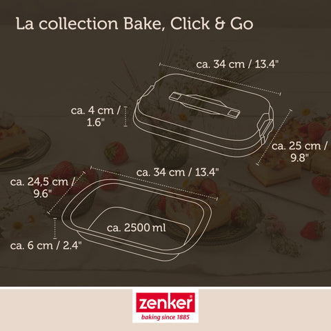 Cette collection de moules à gâteaux innovants est proposée par la marque de pâtisserie Zenker. La collection porte bien son nom puisque les moules à gâteaux servent non seulement à cuire vos pâtisseries mais aussi à les emporter directement dans le moule de cuisson afin de les partager. Ces moules à gâteaux possèdent donc un couvercle fabriqué en Allemagne à l'aide de ressources renouvelables, comme les déchets issu de la production de biomasse ou encore du plastique de seconde génération. Sur chaque couvercle vous pouvez également apposer des étiquettes magnétiques afin d'inscrire le parfum de votre gâteau par exemple ou votre nom. Grâce à la poignée située au-dessus du couvercle vous avez ainsi la possibilité de transporter votre gâteau tout juste sorti du four pour le partager avec vos proches. De plus, les moules possédant une charnière ont un plateau anti débordements permettant d'éviter les fuites de pâte dans votre four. Les bords de ces moules à gâteaux sont assez hauts pour confectionner des gourmandises généreuses. Le revêtement antiadhésif en Téflon vous offre d'excellentes performances de démoulage et de nettoyage. Testez la nouveauté et l'innovation et partagez vos gâteaux avec cette collection de moules à gâteaux munis de couvercle. Notre coup de cœur de la collection est le moule rectangulaire aux bords arrondis car il permet de cuire à la fois des gâteaux et des gratins, à emporter bien sûr !