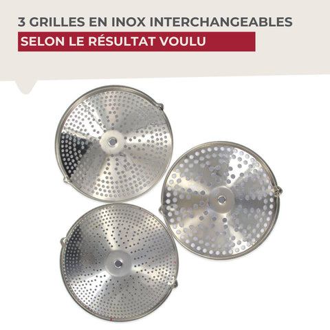 Le moulin à légumes Fackelmann vous permet de réduire les aliments en purée. Les trois grilles de découpe s'adaptent à tous types de fruits et de légumes.