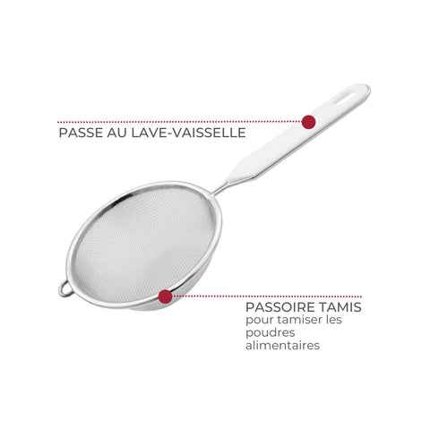 Il vous sera possible de tamiser des ingrédients à incorporer dans les recettes mais également de saupoudrer du cacao, du sucre glace ou autre au-dessus d'un gâteau, d'un tiramisu, d'un chocolat viennois, d'une tarte aux fruits. Cette passoire tamis passe au lave-vaisselle pour ne pas vous encombrer avec le nettoyage.