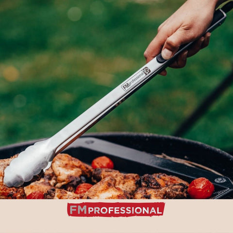 FM Professional vous propose cette pince à barbecue en acier inoxydable avec une poignée plastique et un œillet pour garder la pince fermée afin de la ranger plus facilement.