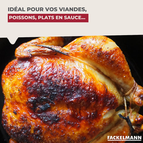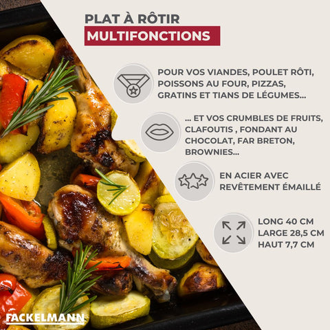 Découvrez le plat à rôtir en acier émaillé Fackelmann, parfait pour vos viandes, poissons et recettes sucrées. Résistant jusqu'à 250°, compatible congélateur et lave-vaisselle pour un nettoyage facile.