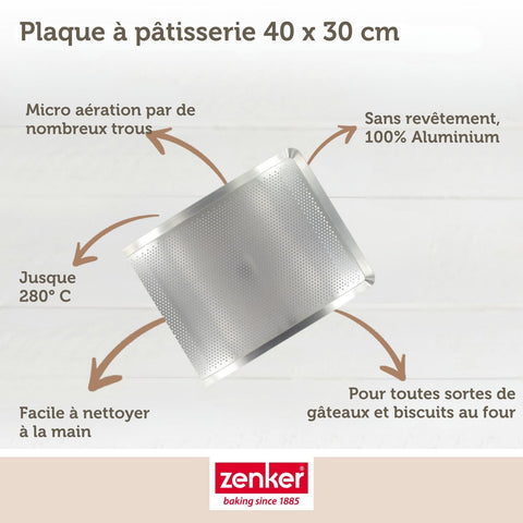 Zenker vous propose cette plaque de pâtisserie perforée entièrement en acier inoxydable 18/10 de haute qualité pour cuire tous vos biscuits comme des sablés, des brioches, des Mannele, des gâteaux spritz etc.
