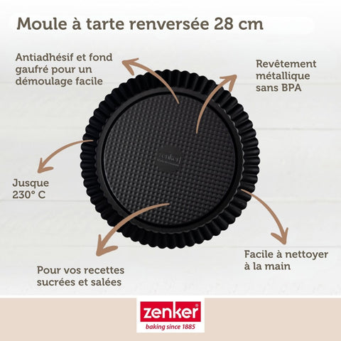 Le plat à tarte de Zenker mesure 30 cm de diamètre. Il s'agit d'un moule à tarte renversée. On y fait cuire sa pâte à tarte sablée puis on la retourne pour la garnir. La technique idéale pour réaliser une tarte aux fraises ou une tarte aux framboises.
