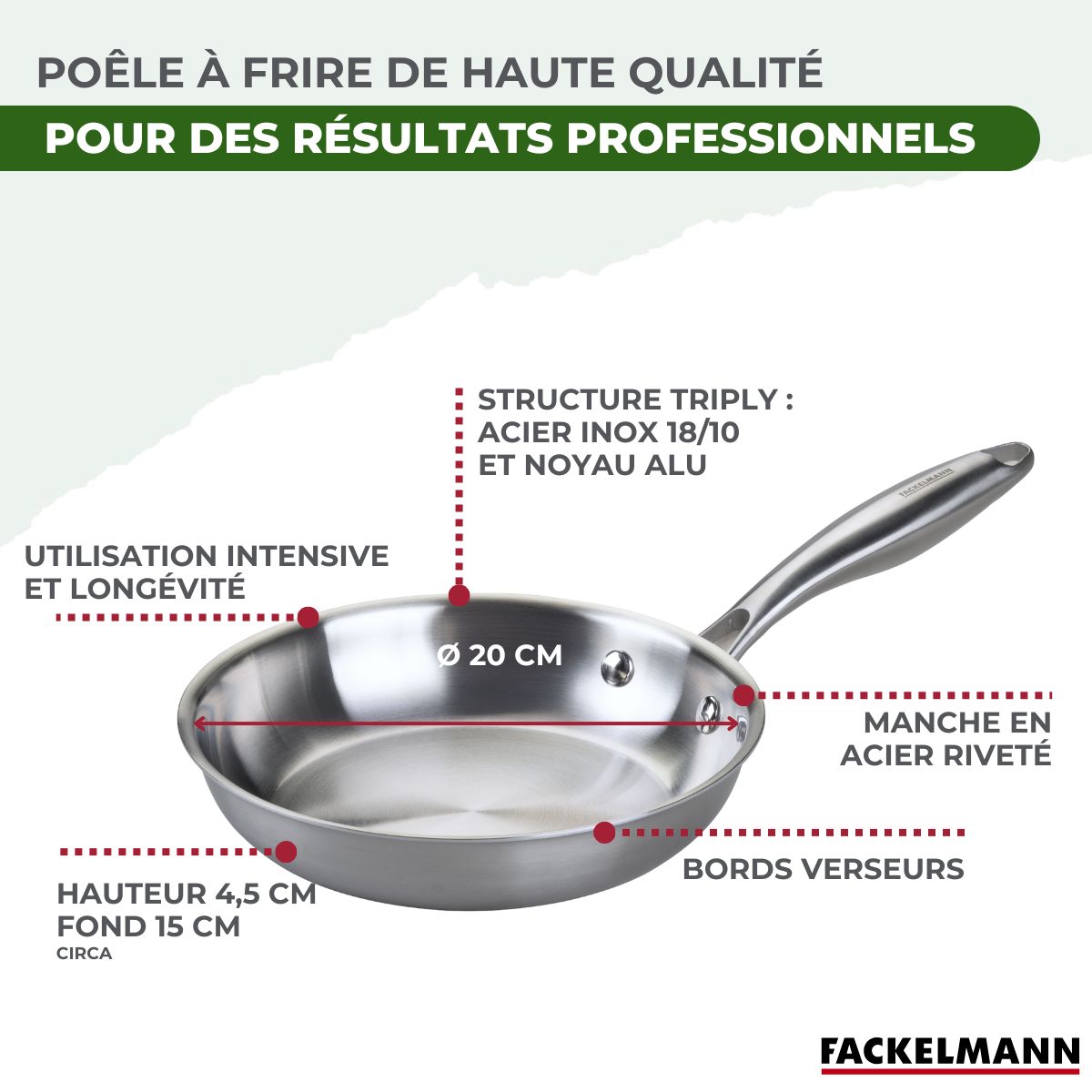 La série Vita3 de Fackelmann cm a été conçue pour ceux qui recherchent une cuisine plus naturelle, saine et efficace. Avec sa structure triply, la poêle à frire 20 cm Fackelmann Vita3 combine une couche intérieure et extérieure en acier inoxydable 18/10 avec un noyau en aluminium, ce qui garantit une répartition homogène de la chaleur sur toute la surface.