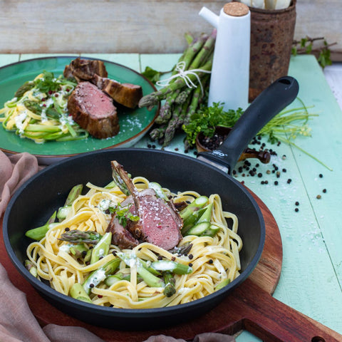 La poêle à frire Alucast est très solide et permet de cuisiner pour quatre personnes facilement grâce à son grand diamètre. Dans notre poêle à induction vous pourrez notamment cuire de la viande car cette poêle de cuisine permet une cuisson longue qui garde la viande tendre.