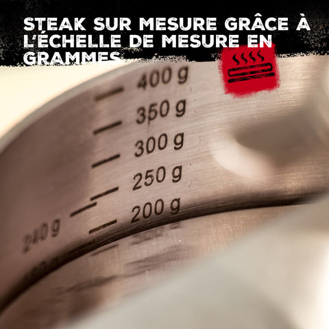 Conseils d'utilisation : Déposez une boule de viande hachée sous la presse. Appuyez sur le poussoir et surveillez les graduations en gramme pour contrôler la quantité de viande manquante ou en surplus.