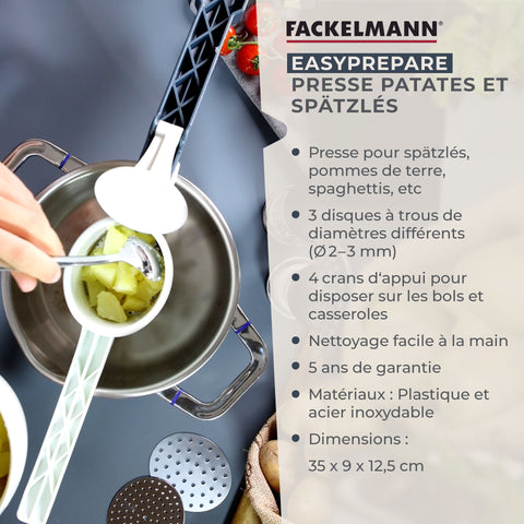 Fackelmann vous propose ce presse-purée manuel de la collection Easy Prepare. Cette collection regroupe des ustensiles très pratiques pour la préparation de vos plats et recettes sans avoir besoin de l'intervention d'un robot électrique. Ce presse purée peut aussi servir à réaliser des spaëtzles alsaciens.
