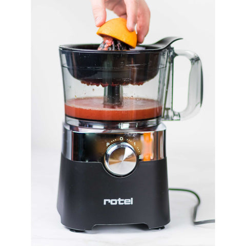 Rotel propose ce robot de cuisine multifonction pour râper, trancher, mélanger et pétrir rapidement et facilement. Il possède un mixeur blender et une fonction de presse agrume.