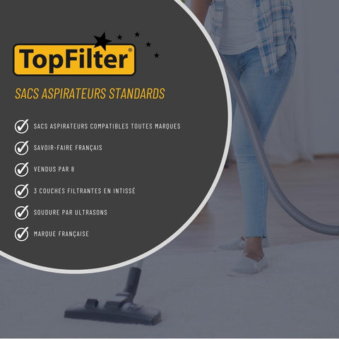 TopFilter est spécialisée dans l'assemblage et le conditionnement de sacs aspirateurs depuis plus de 40 ans. L'entreprise Vosgienne met tout en œuvre pour proposer des sacs aspirateur hauts de gamme à un prix abordable. Les trois couches composant les sacs TopFilter permettent une haute capacité de filtration des poussières. Les sacs TopFilter sont très résistants et prennent soin des aspirateurs afin de conserver leur aspiration le plus longtemps possible.