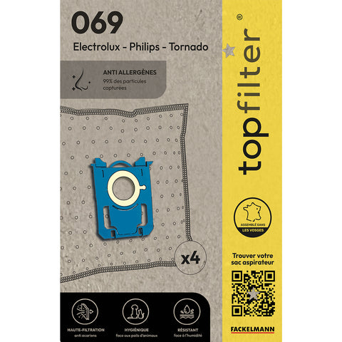 TopFilter, fabricant français de sacs d'aspirateurs, propose ce lot de 4 sacs aspirateur pour Philips, Tornado et Electrolux entre autres. Le sac aspirateur permet de retenir les acariens et la poussière.