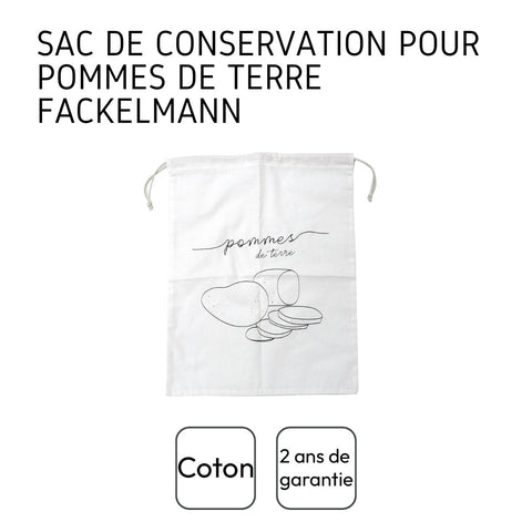 La cuisine doit être un endroit plaisant, rangé, organisé et fonctionnel pour que vous ayez envie de cuisiner de délicieux petits plats. Pour garder la cuisine fonctionnelle, vous pouvez ranger vos aliments dans des boîtes ou des sacs de conservation. C'est dans ce but que Fackelmann vous propose ce sac de conservation en coton pour y ranger vos pommes de terre bien au sec. Ce sac de conservation possède également deux cordons que vous pouvez resserrer afin de fermer le sac pour maintenir les pommes de terre à l'abri des insectes et de la lumière.