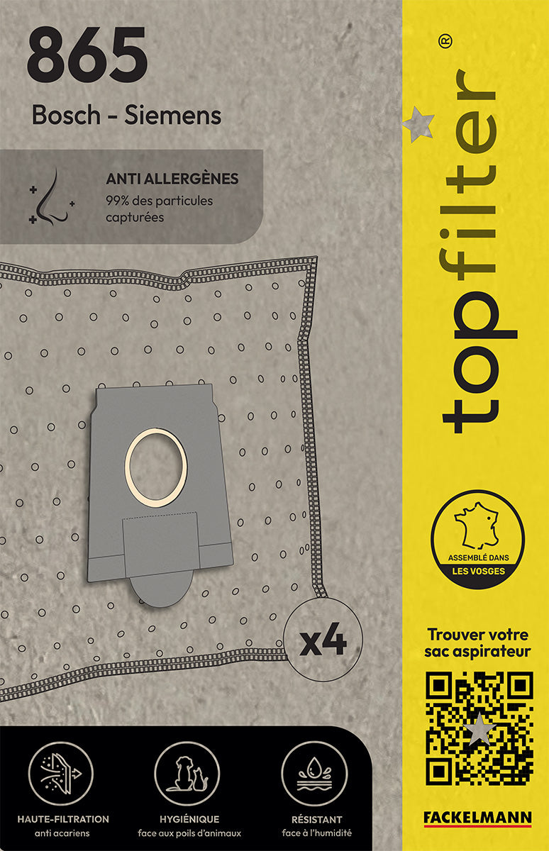 Les sacs aspirateur de TopFilter multicouches en non-tissé (100% synthétique) sont fabriqués et conditionnés en France. Ils sont équipés d’une cartonnette avec un joint en caoutchouc et fermeture hygiénique pour une haute capacité de filtration et une étanchéité sans défaut.