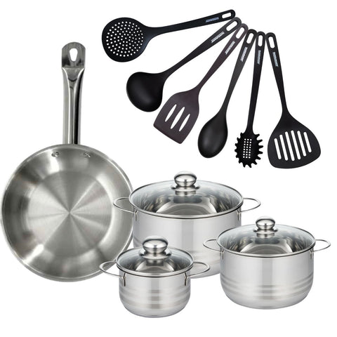 Cet ensemble de cuisson Fackelmann Eterna comprend une poêle en inox 18/8 de 28 cm, idéale pour les repas familiaux, et trois faitouts en inox (16, 20, 24 cm) pour une cuisson saine et économisant l'énergie. Les 6 ustensiles de service et de cuisson en RPET noir complètent ce set avec praticité, pour cuisiner et servir toutes vos recettes.