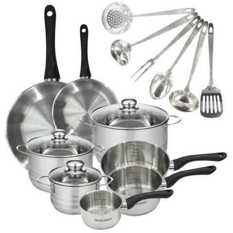 Set 2 poêles 20 28 cm 3 casseroles 12 16 20 cm, 3 faitouts 16, 20 et 24 cm en inox et 6 ustensiles inox Fackelmann Geneva