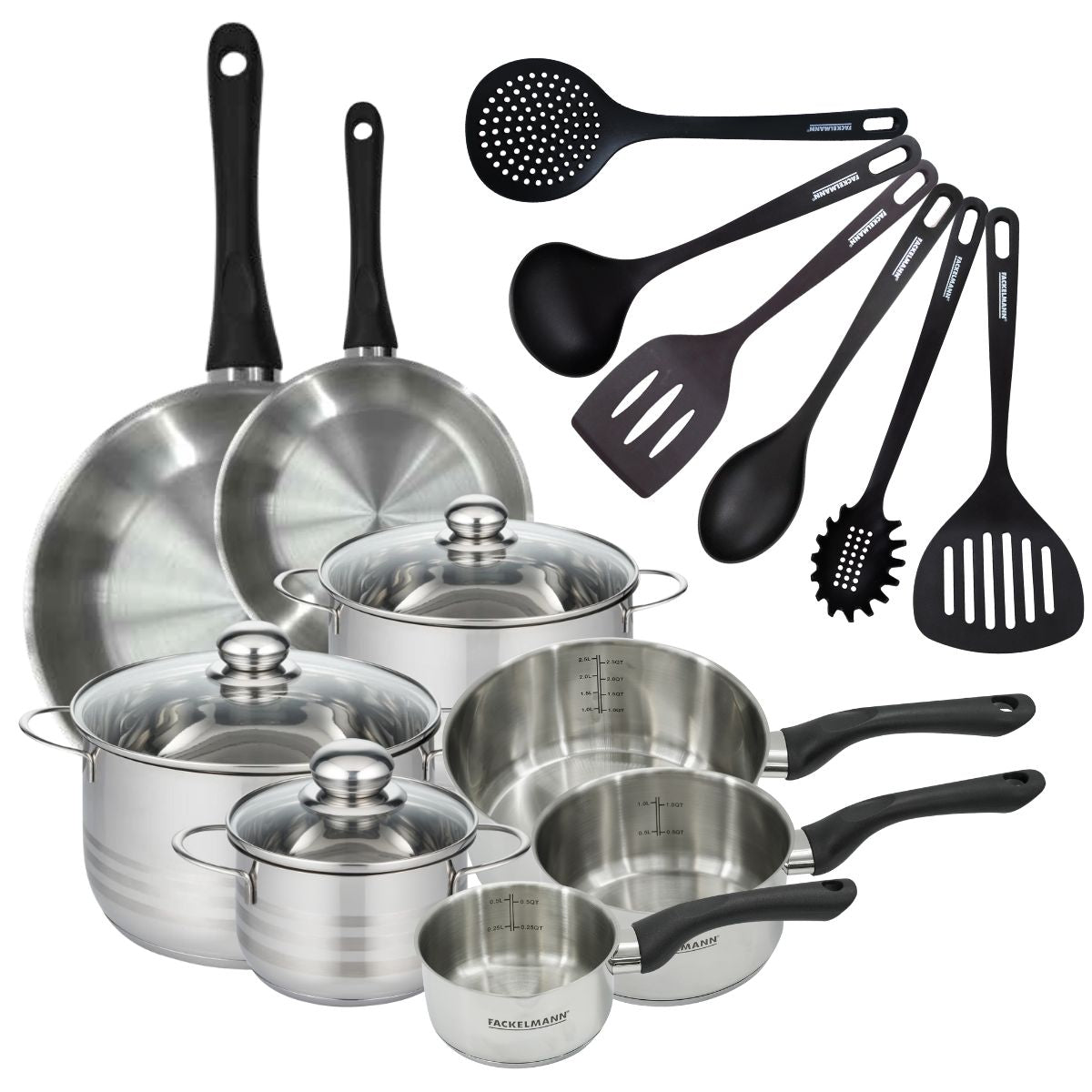 Set 2 poêles 20 28 cm 3 casseroles 12 16 20 cm, 3 faitouts 16, 20 et 24 cm en inox et 6 ustensiles RPET Fackelmann Geneva