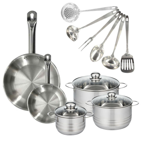 Tout inox et de haute qualité, elle comprend 2 poêles de 20 cm et 28 cm en acier inoxydable 18/8, 3 faitouts de 16 cm, 20 cm et 24 cm, et 6 ustensiles de cuisson et de service.
