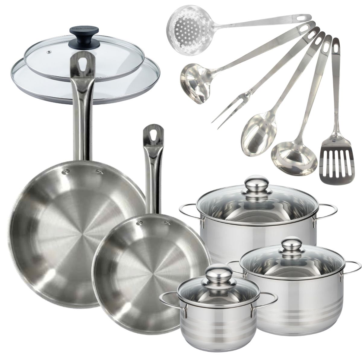 Set 2 poêles 24 et 28 cm en inox et couvercles, 3 faitouts inox 16, 20 et 24 cm et 6 ustensiles inox Fackelmann Eterna