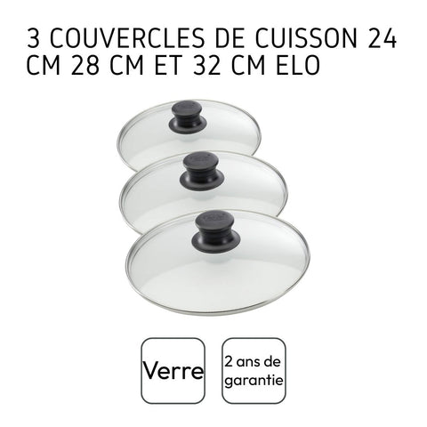 Elo vous propose ce set de 3 couvercles de casserole de 24 à 32 cm de diamètre. Ces couvercles en verre conviennent à toutes les marques de poêles et de casseroles du commerce. Avec ces couvercles vous pourrez cuire vos aliments tout en surveillant la cuisson.