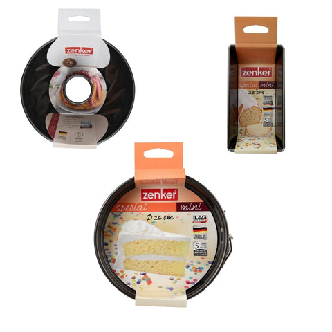 Zenker vous propose ce set de 3 mini moules avec 1 moule à manqué avec charnière, 1 moule à kougelhopf (ou kouglof) et 1 moule à cake rectangle. Les petits formats proposés vous permettront de préparer des cakes sucrés et/ou salés, des gâteaux, en plus petite quantité et ainsi éviter le gaspillage. Ce set vous permet d'avoir les moules essentiels sous la main