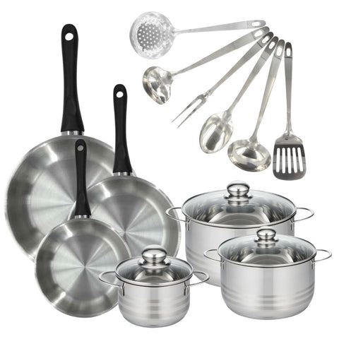 Découvrez notre batterie de cuisine Fackelmann Geneva composée de 3 poêles de 20, 24 et 28 cm en inox 18/8, et de 3 faitouts de 16, 20 et 24 cm en inox. Associée à 6 ustensiles également en inox, elle est parfaite pour toutes vos préparations culinaires, et allie fonctionnalité et qualité.