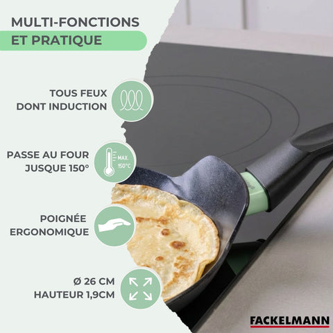 La crêpière Fackelmann Brandao de 26 cm est conçue pour offrir une expérience de cuisson parfaite. En aluminium pressé recyclé avec revêtement céramique sans PFAS, cette poêle à crêpes garantit une cuisson saine, avec peu de matière grasse et sans adhérence. Vous y réussirez aussi bien les œufs au plat et les omelettes que les crêpes.