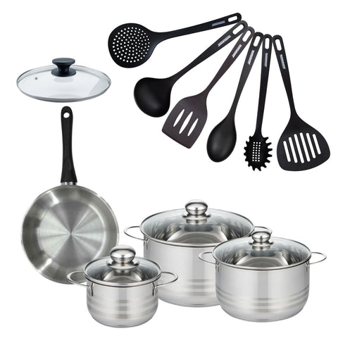 Découvrez cette batterie de cuisine Fackelmann Geneva, comprenant une poêle en inox 18/8 de 20 cm et son couvercle en verre, trois faitouts en inox de 16, 20 et 24 cm et 6 ustensiles de cuisson et de service pratiques en RPE. Un set élégant et de haute qualité, parfait pour cuisiner en toute confiance et avec praticité.