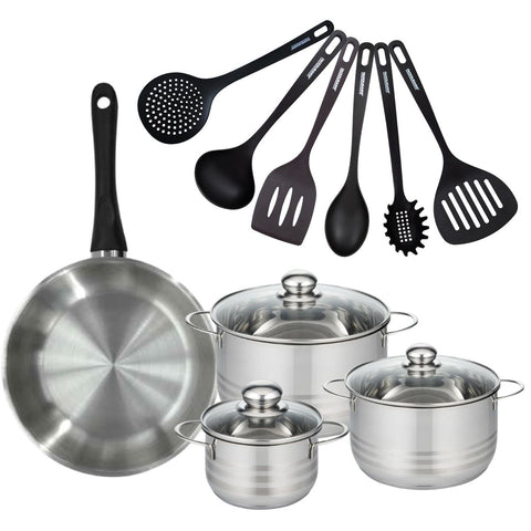 Découvrez notre ensemble de cuisine Fackelmann Geneva comprenant une poêle en inox 18/8 de 28 cm, trois faitouts de 16, 20 et 24 cm ainsi que 6 ustensiles de cuisson et de service pratiques en RPET. Parfaits pour tous vos plats.