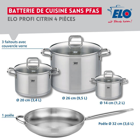 Découvrez notre batterie de cuisine en inox sans PFAS de haute qualité de la marque Elo, idéale pour tous vos besoins culinaires. Elle comprend une poêle à frire de 32 cm, accompagnée de trois faitouts de diverses tailles : 14 cm, 20 cm et 26 cm de diamètre. Elle forme un ensemble polyvalent qui sait réaliser toutes les cuissons au le quotidien, et satisfaire les cuisiniers les plus exigeants !