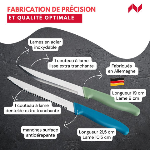 Leurs manches en PP offrent une prise en main optimale grâce à leur surface antidérapante, rendant la découpe agréable et sécurisée. Ces couteaux fabriqués en Allemagne allient un design coloré à une fabrication de précision et une qualité optimale. Ils se nettoient à la main.