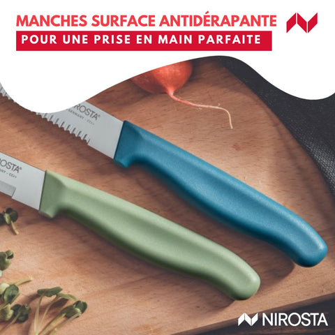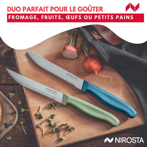 Découvrez ce set de couteaux Nirosta Elemental, comprenant un couteau d'office à lame lisse et un couteau à petit-déjeuner à lame crantée, en acier inoxydable extra tranchantes.