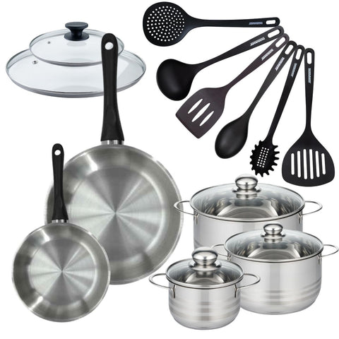 Découvrez cette batterie de cuisine de haute qualité Fackelmann Geneva, comprenant une poêle en inox 18/8 de 20 cm et une de 28 cm, ainsi que leurs couvercles en verre. Ces poêles sont associées à trois faitouts en inox de 16, 20 et 24 cm et 6 ustensiles de cuisson et de service pratiques en RPET. Idéal pour cuisiner des repas savoureux tout en alliant fonctionnalité et élégance.