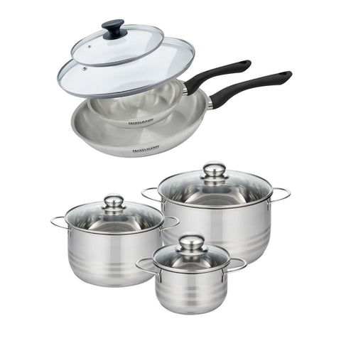 Cet ensemble Fackelmann Geneva allie 2 poêles en inox 18/8 de 20 cm et 28 cm et leurs couvercles en verre pour une cuisson contrôlée, à trois faitouts inox de 16 cm, 20 cm et 24 cm. Un set parfait pour toutes vos préparations.