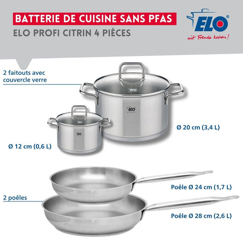 Découvrez le set de 2 poêles de cuisson et 2 faitouts Elo Profi Citrin, une batterie de cuisine complète en inox qui allie performance et élégance.