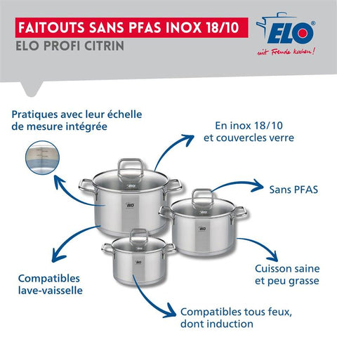 Avec l'ensemble Elo Profi Citrin, vous profitez non seulement de la qualité de l'inox, mais également d'une polyvalence inégalée pour réaliser toutes vos recettes. Que vous soyez un chef expérimenté ou un cuisinier amateur, ce set saura devenir un allié précieux dans votre cuisine. Offrez-vous ce lot de poêles et faitouts et élevez votre expérience culinaire à un niveau supérieur.