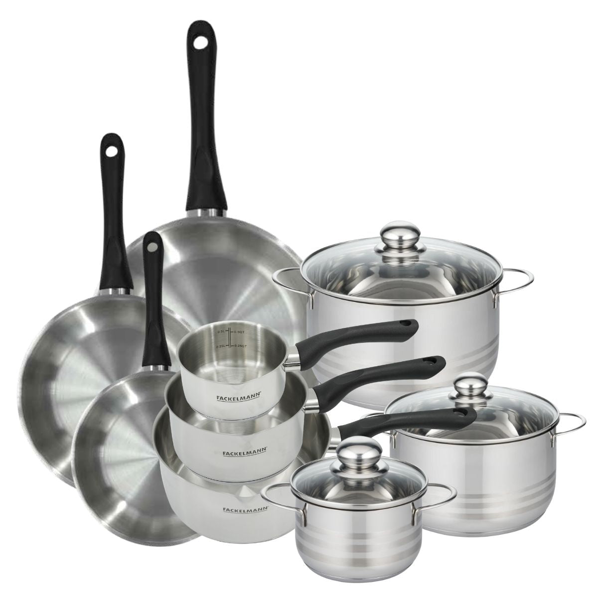 Cette batterie de cuisine complète en acier inoxydable Fackelmann Geneva est idéale pour tous types de feux. Elle comprend des poêles de 20, 24 cm et 28 cm, ainsi que des casseroles de 12 cm, 16 cm, 20 cm, et des faitouts de 16 cm, 20 cm, 24 cm. Sans PFAS, elle assure une cuisson saine et parfaite à toutes vos préparations culinaires.