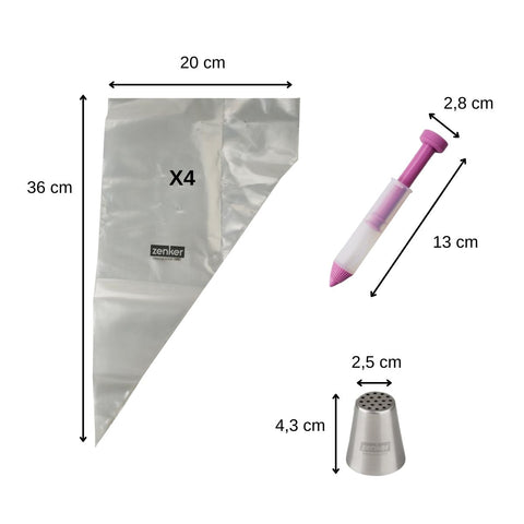 Poche à douille : 20 x 36 cm, douille : 4,3 x 2,5 cm, stylo de décoration : 13 x 2,8 cm